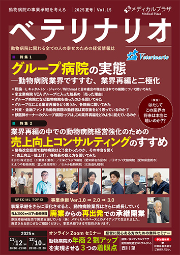 毎年のように変化する業界のトレンドや常識を的確に捉えたテーマをリアルタイムに盛り込んだ内容は、病院の今後を考えるベテラン獣医師、自身の将来を岐路に立って考える若い獣医師にとって事業承継による病院の譲渡や開業という新しい着眼点を提起する唯一の情報誌です。